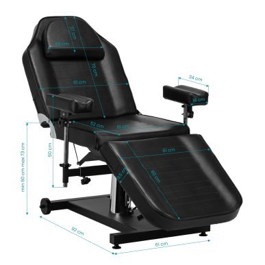 The chair is equipped with a hydraulic actuator that allows for smooth height adjustment from 60 to 73 cm. Both the backrest and footrest have a manual angle adjustment, allowing for a customized positioning to suit the type of procedure being performed. The movable, recessed armrests are easy to remove and adjust. They allow for angle, height, and tilt adjustment, providing comfortable, stable support and even greater freedom of work for the tattoo artist. All of these features increase client comfort and facilitate precise tattooing.