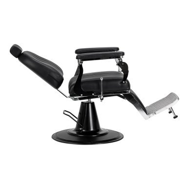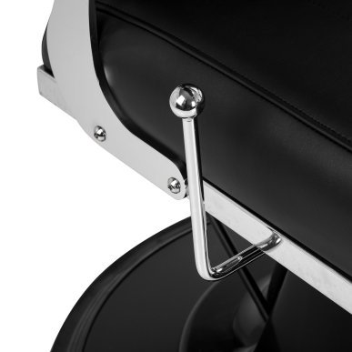 The stable base provides secure support and high comfort of use. The seat is filled with deformation-resistant foam and upholstered with semi-matt synthetic leather, guaranteeing durability and comfort for a long time. The materials are distinguished by their resistance to moisture and ease of cleaning. The black upholstery combined with metal chrome elements and a decorative footrest give the chair a distinctive, classic character. Vertical stitching emphasises the vintage style, which fits perfectly into the atmosphere of professional barbershops. Carefully refined details give the whole a representative look, and the functional design promotes comfortable and effective work.