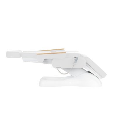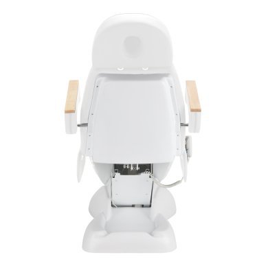 The chair is filled with foam of appropriate hardness and covered with pleasant-to-the-touch imitation leather in shades of white. Thanks to the use of a material that is easy to keep clean and resistant to selected disinfectants, the equipment is comfortable to use, resistant to moisture and easy to clean. A solid base made of durable material in shades of whiteensures stability during treatments. Decorative wooden elements on the armrests distinguish the chair from other models, being a visually appealing, elegant accent. Properly profiled hems give the chair a stylish look and make the seat ergonomic.