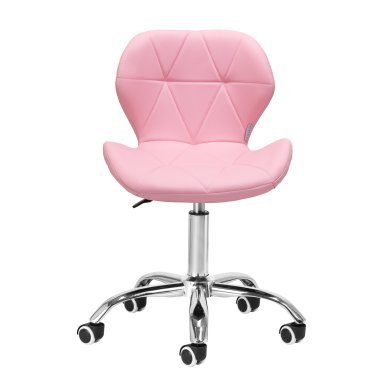 The five-star base in chrome shades is equipped with rubberized wheels, providing considerable mobility and allowing the furniture to move freely around the workplace. The seat is upholstered with pleasant-to-touch faux leather in an elegant shade of pink. The material guarantees durability, resistance to moisture, and ease of cleaning. The design is complemented by stylish stitching, emphasizing the modern look.