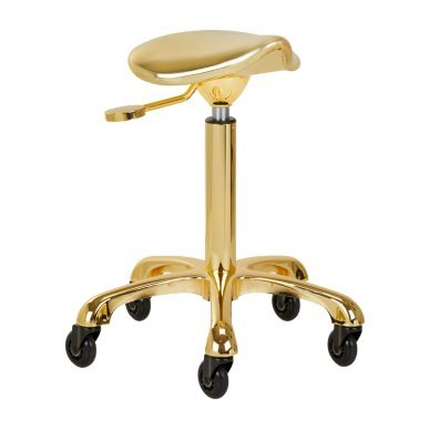 The unique look of the stool is memorable, looks extremely elegant and will be a stylish element of any interior. It will be perfect for both hairdressing and beauty salons. A chrome-plated frame and a stable five-star base with rubber wheels ensure safe use, considerable mobility and the ability to adapt to your needs. Properly profiled in the shape of a saddle, the seat filled with non-deformable foam guarantees comfort to users. The covering made of semi-matte synthetic leather in shades of gold is easy to clean, durable and resistant to moisture.