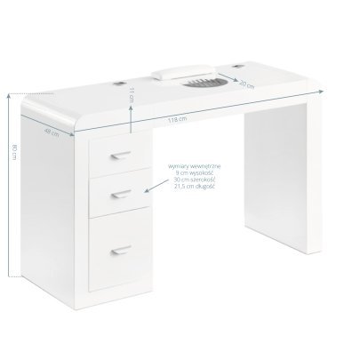 Three spacious drawers make it easier to organize and keep the most necessary cosmetics and tools in order. The desk is equipped with a practical absorber that effectively reduces the amount of harmful dust, providing clean and fresh air in the workplace. At the same time, thanks to its integration into the tabletop, it does not take up valuable work space. Specially designed places for cables make it easier to organize necessary devices in the salon, such as nail drill machines, treatment lamps or nail lamps, allowing you to hide the cables.