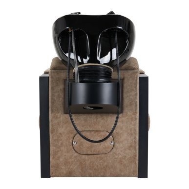 A properly profiled chair filled with durable foam ensures high comfort of use and geometric, partially upholstered armrests allow for correct positioning of the client's shoulders. The backrest is placed at an optimal angle and provides excellent support for the spine. Cover made of synthetic leather in shades of brown guarantees long-term durability and ease of cleaning. The original, elegant look of wash adds the interior's unique expression. Stabilization legs add stability and subtly emphasize the stylish character of the hairdressing wash unit. The set includes complete fittings with a matte finish in shades of black, including a faucet, shower head and dedicated hoses to provide a complete set of tools for work.