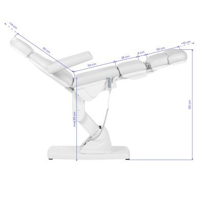 The specially designed footrest significantly facilitates pedicure and podiatry treatments. It is wide and stable, and its angle can be smoothly adjusted using an electric remote control. This solution allows for comfortable leg support and proper positioning, increasing the comfort of both the client and the person performing the treatment. The extendable footrest makes the chair perfectly suited to taller users, providing them with adequate support. The removable end of the footrest allows the practitioner to have full freedom of access to the feet and toes, providing greater comfort and precision during demanding treatments. With the seat raised to its maximum height, the footrest extended, and the cradle tilted, the height reaches approximately 120 cm, further facilitating precise work during specialist podiatry procedures.