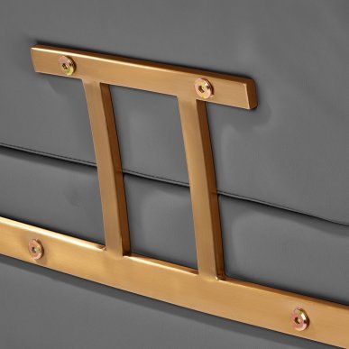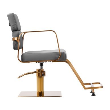The full rotation mechanism of the chair makes the hairdresser's work more effective and comfortable. A solid, flat, square-shaped base guarantees stability during use. The matte-finished, smooth surface gives the element an elegant look and makes it easy to keep clean. A comfortable seat with foam filling ensures high comfort of use, even during many hours of treatments. Geometric, metal armrests in shades of gold allow for the correct positioning of the client's shoulders – this means that he does not bury his head in his shoulders or slouch – which makes it much easier to perform precise treatments, including haircuts. A stylish footrest dedicated to this model provides stable support for the user's feet.