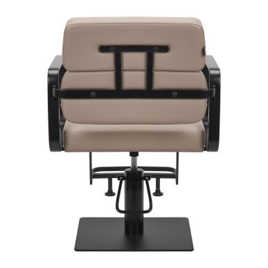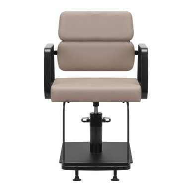 The full rotation mechanism of the chair makes the hairdresser's work more effective and comfortable. A solid, flat, square-shaped base guarantees stability during use. The matte-finished, smooth surface gives the element an elegant look and makes it easy to keep clean. A comfortable seat with foam filling ensures high comfort of use, even during many hours of treatments. Geometric, metal armrests allow for the correct positioning of the client's shoulders – this means that he does not bury his head in his shoulders or slouch – which makes it much easier to perform precise treatments, including haircuts. A stylish footrest dedicated to this model provides stable support for the user's feet.