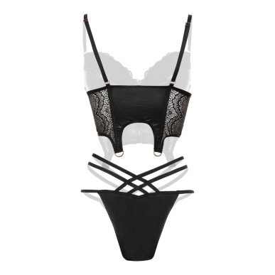 L’ensemble bustier Wetlook Monroe marie l’éclat sensuel du wetlook à la finesse d’une dentelle raffinée. La matière brillante épouse harmonieusement les courbes, tandis que les anneaux dorés, le zip frontal métallique et les bonnets préformés créent une allure audacieuse et haut de gamme. Grâce aux bretelles réglables, à sa coupe ajustée et au string spider wetlook inclus, cet ensemble se porte aussi bien en lingerie de luxe qu’en top tendance pour les soirées et événements.