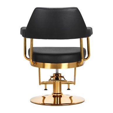 The chair is filled with foam, which is durable and does not deform, ensuring comfortable use for a long time. The upholstery is made of pleasant to the touch imitation leather with a specific structure. Thanks to the use of such material, the equipment is resistant to moisture, durable and easy to clean. The covering in shades of black and decorative elements in gold hues give it an expression of timeless elegance. It is distinguished by a tasteful finish, which gives it an exclusive character and makes it look great in many professional salons.