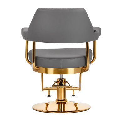 The chair is filled with foam, which is durable and does not deform, ensuring comfortable use for a long time. The upholstery is made of pleasant-to-the-touch imitation leather with a specific structure. Thanks to the use of such material, the equipment is resistant to moisture, durable and easy to clean. The covering in shades of grey and decorative elements in gold hues give it an expression of timeless elegance. It is distinguished by a tasteful finish, which gives it an exclusive character and makes it look great in many professional salons.