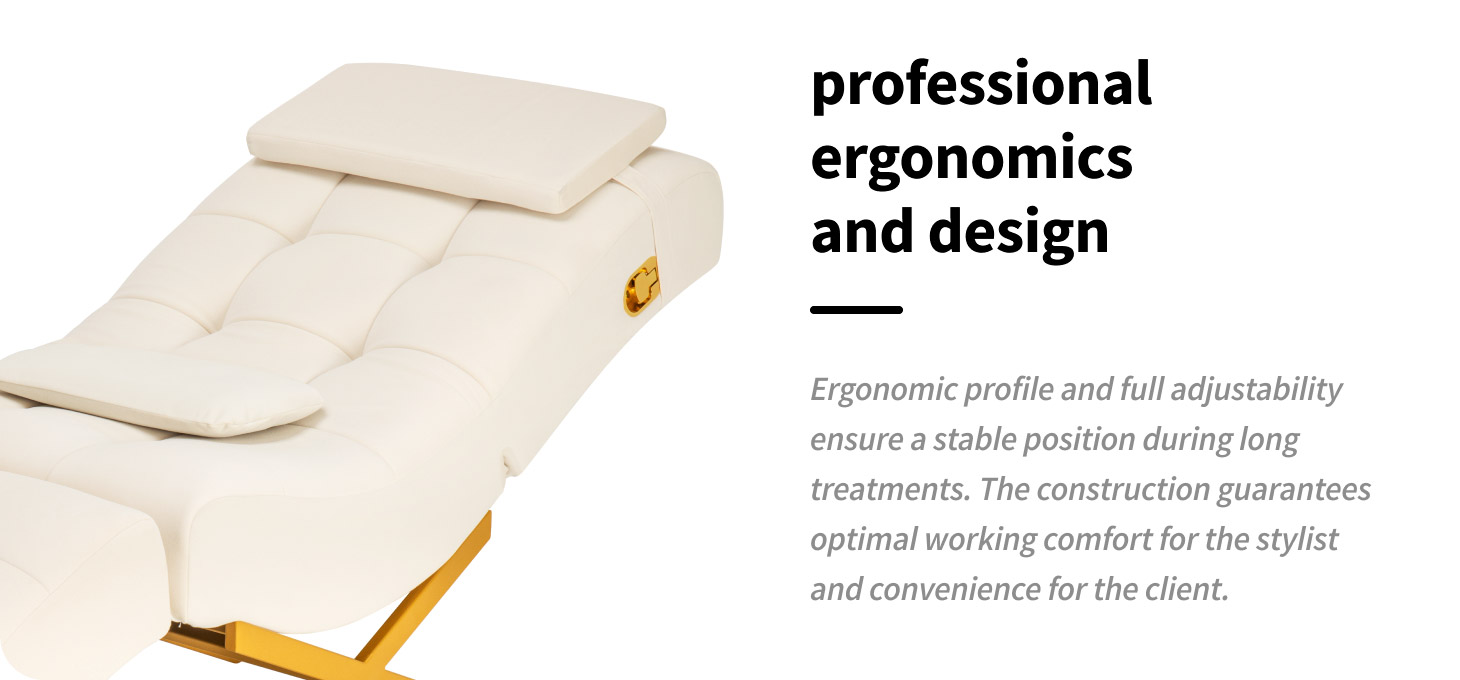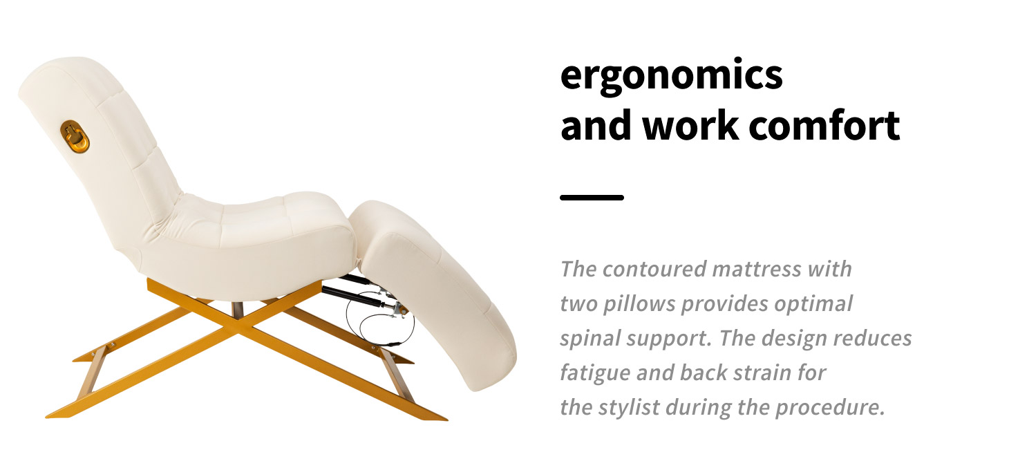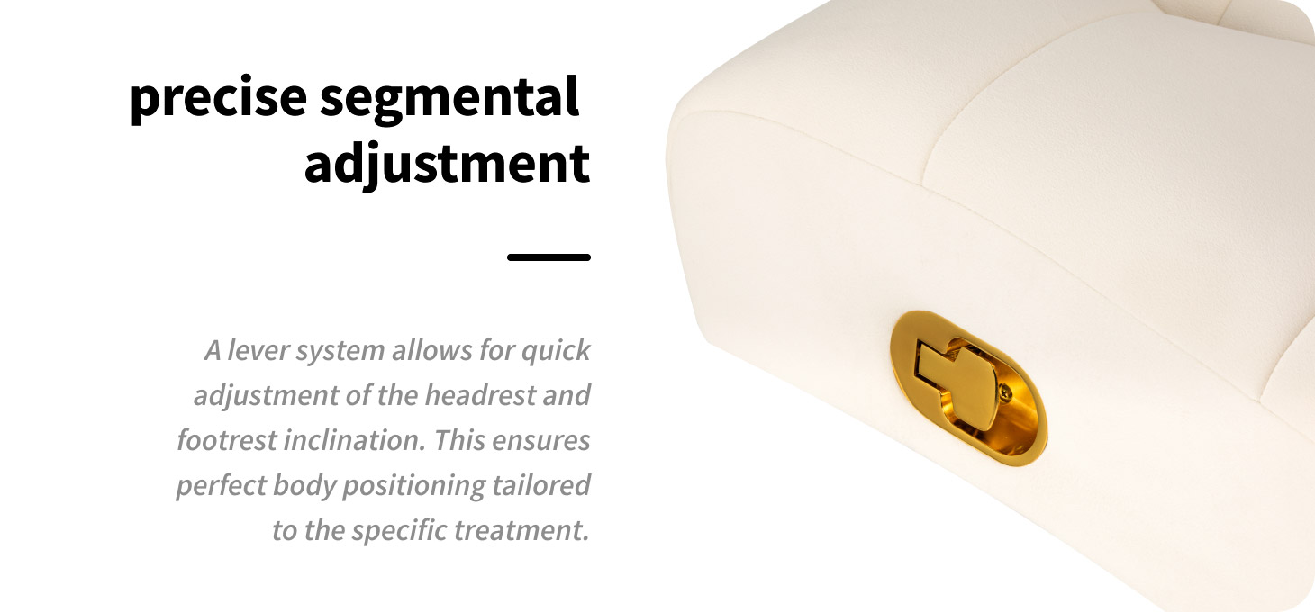 The movable headrest and footrest allow for precise adjustment of the body position to the type of treatment performed and the individual needs of the client. Adjustment is carried out using discreet levers that allow you to quickly and conveniently change the angle of individual segments. This solution increases comfort during eyelash styling and other longer services, while facilitating ergonomic positioning of the workstation.