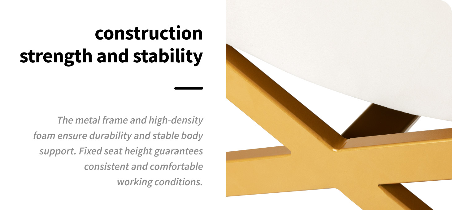 The treatment chair is filled with foam of optimal hardness, ensuring stable and comfortable body support. The fixed seat height guarantees stable working conditions, and the solid metal frame in shades of gold ensures durability and safety of use. The white velour upholstery emphasises the elegant character of the furniture . The classic colour combination and quilting give the whole a luxurious, timeless look. The design combines aesthetics with functionality, making the chair a perfect fit for professional interiors.