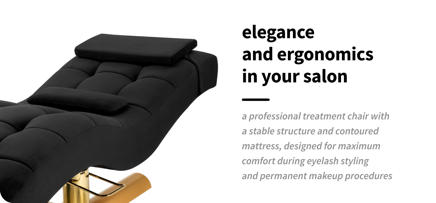 Sillon Corona is a professional treatment chair designed for eyelash styling, created with beauty salons and eyelash and eyebrow styling salons in mind. Its stable construction combined with an ergonomically contoured mattress ensures high comfort even during long hours of eyelash extension and thickening treatments, permanent make-up or eyebrow styling. The modern form and elegant combination of black and gold emphasise the professional image of the salon.