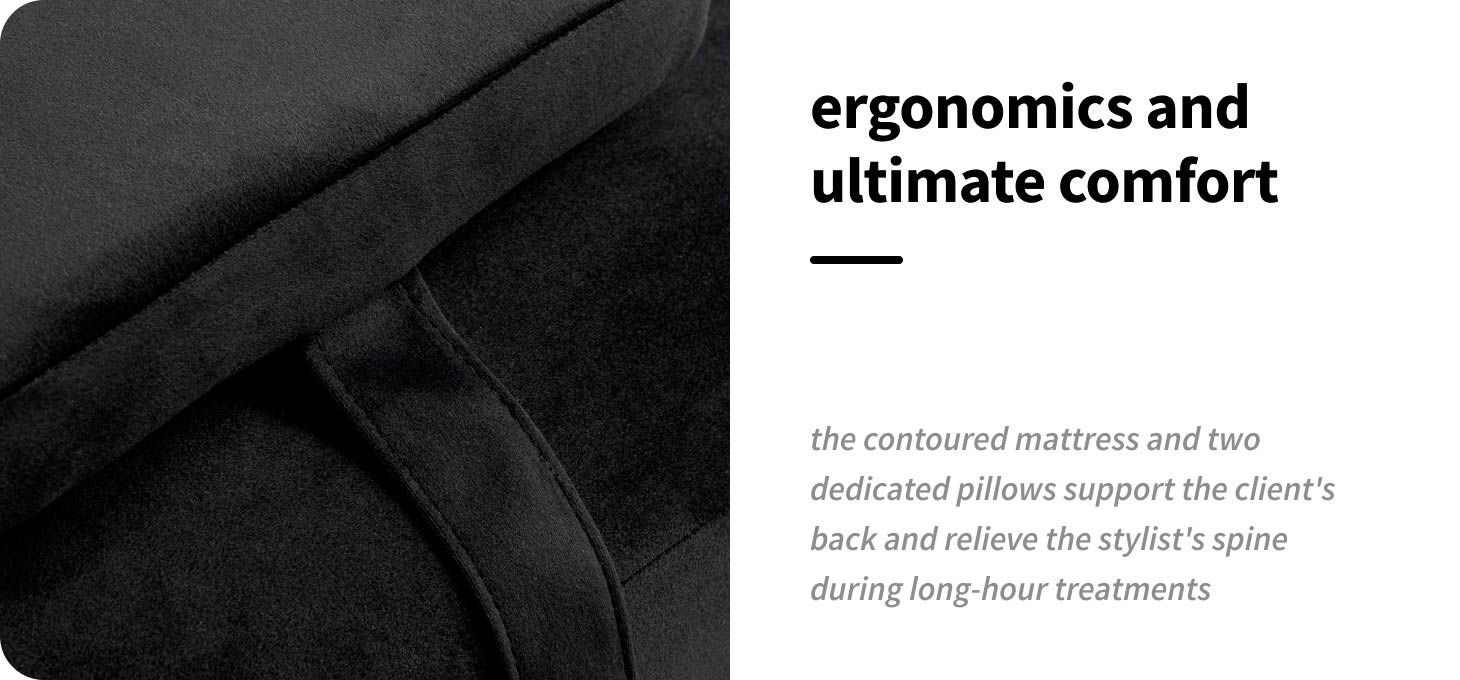 The ergonomically contoured mattress supports the back and promotes muscle relaxation, allowing you to maintain a stable, comfortable position throughout the treatment. The thoughtful design also supports the specialist's correct working posture, helping to reduce fatigue during long hours of service. The set includes two cushions that increase the comfort of the body position and allow for better adjustment to the individual needs of the client.