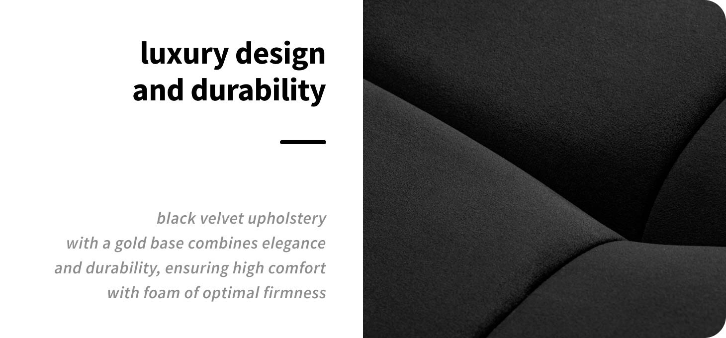 The treatment chair is filled with foam of optimal hardness, ensuring the perfect balance between softness and stable body support. The black velour upholstery emphasises the elegant and professional character of the equipment . The solid metal base in shades of gold ensures durability and safety of use, while the quilted stitching and classic colour combination give the whole a luxurious, timeless character. The design combines aesthetics with functionality, making the chair a perfect fit for professional interiors.