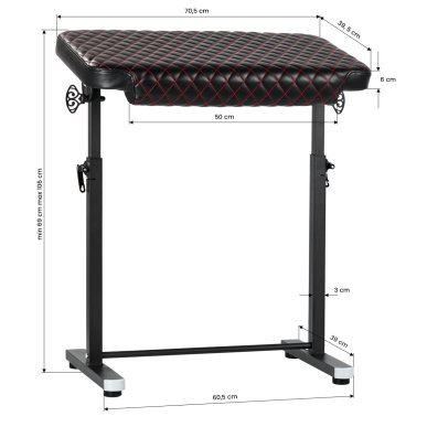 The armrest height is adjustable within the range of 69-106 cm, which allows it to be adapted to different clients and guarantees optimal support during the tattoo session. Thanks to the tilt adjustment function, you can adjust the armrest’s positioning to the individual needs of the client and the characteristics of the procedure, providing even more comfort during tattooing.